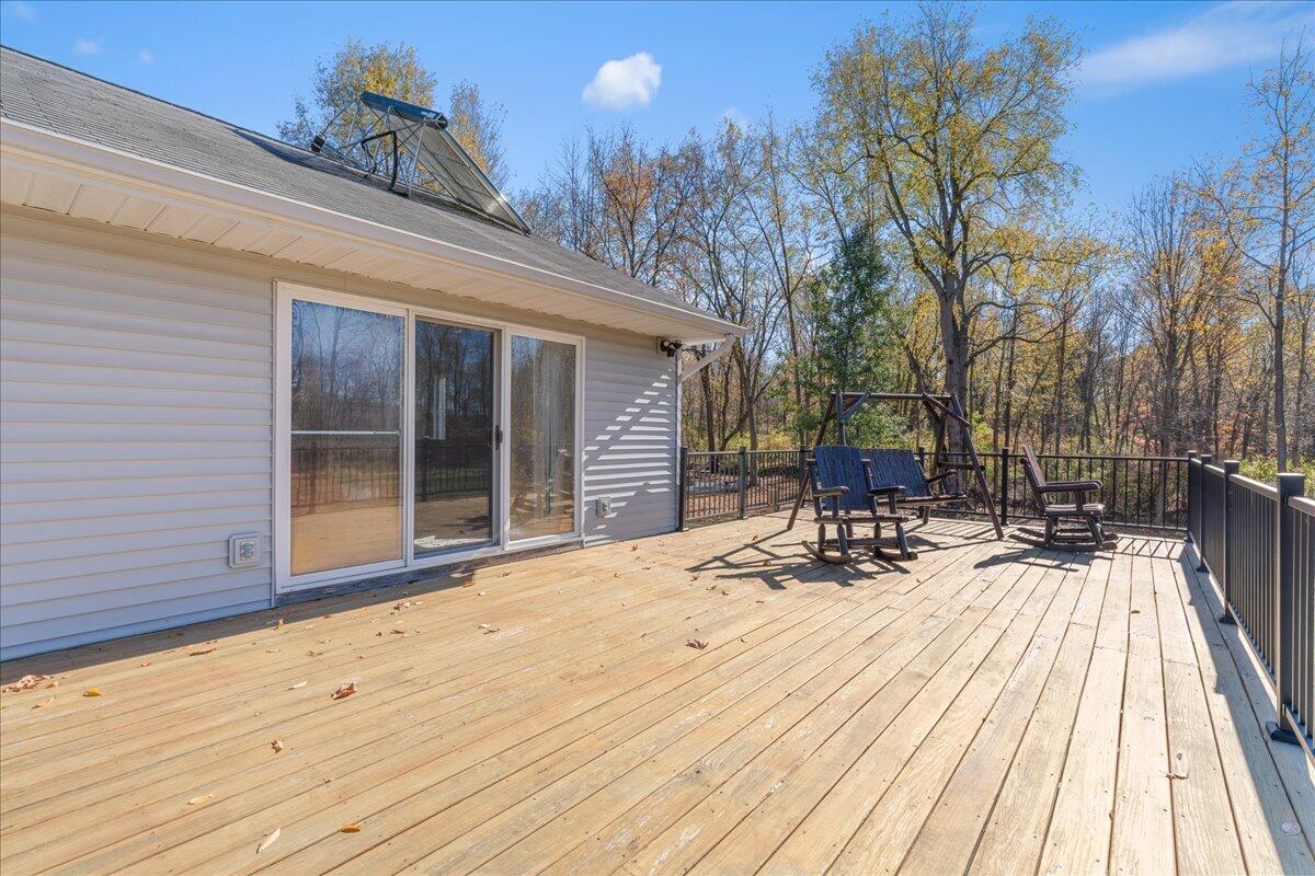 This beautiful, custom-built executive ranch sits atop nine secluded, densely wooded acres, offering exceptional privacy and natural beauty. The home features a spacious main-floor primary suite with an en-suite bath, large walk-in closets, a marble shower, and a relaxing whirlpool tub. An open floor plan with cathedral ceilings enhances the sense of space, while EnergyStar efficiency ensures comfort and performance throughout. The fully finished walkout lower level provides additional living space with a cozy rec room and fireplace, two generous bedrooms, and a full bath--perfect for guests or family.A true highlight of this property is the impressive nearly 4,000 sq. ft. pole barn. Designed for versatility, it includes two separate heated spaces, two 14' access doors on one side, and a 2.5-car access door on the other. The building is also plumbed for a full bath and offers the potential to include a kitchen--ideal for a workshop, hobby space, or business use.
