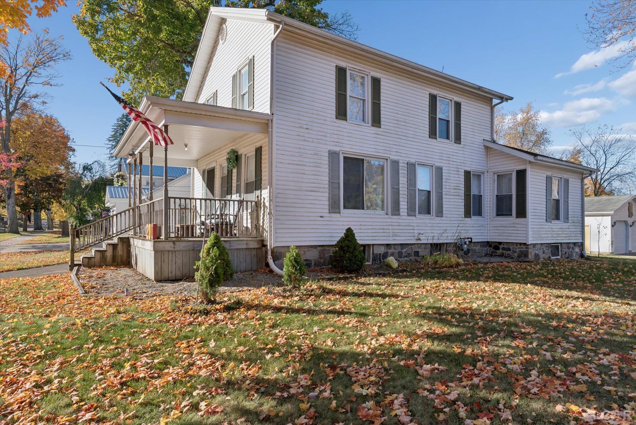 Welcome to 200 Grove Street, Hudson, MI — a warm and inviting two-story home offering classic charm, generous living space, and a fantastic central location. Step onto the covered front porch—perfect for relaxing mornings or evenings with a cup of coffee—and feel right at home. Inside, you’ll find beautiful original woodwork and staircase details, large windows filling the rooms with natural light, and an abundance of personality throughout. The spacious living room stretches from front to back, offering room for multiple seating areas or a home office setup. The adjoining formal dining room features bright windows and is ideal for family dinners or entertaining guests. Upstairs, the home includes comfortable bedrooms with unique color palettes and plenty of natural light. Two full bathrooms offer functionality and opportunity for personalization. The main floor also includes a dedicated laundry area, and outside you’ll find a large detached 2-car garage with additional storage space. Enjoy being close to downtown Hudson, local parks, and schools while appreciating the character and creativity that make this home stand out.