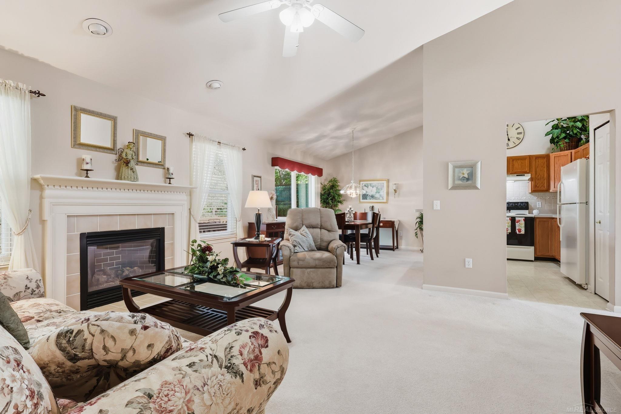 Enjoy comfort and convenience in this beautifully maintained 2-bedroom, 2-bath attached condo located in the desirable Brookside community. Step inside to an inviting, open layout featuring vaulted ceilings and a bright, spacious family room centered around a cozy gas fireplace—perfect for relaxing or entertaining guests. The adjoining dining area flows seamlessly into the well-appointed kitchen, offering ample cabinet and counter space for all your cooking needs. The private primary suite includes an 8x5 walk-in closet and a full bath with a step-in shower. A second bedroom and nearby full bath provide flexibility for guests or a home office. Enjoy peaceful outdoor living on the private deck surrounded by privacy foliage, offering a serene natural backdrop. Additional highlights include a first-floor laundry room, attached 2-car garage, and a full open basement providing abundant storage or the potential for future finishing. Conveniently located near shopping, dining, and parks with easy access to M-59, this home combines comfort, low-maintenance living, and a welcoming community atmosphere.