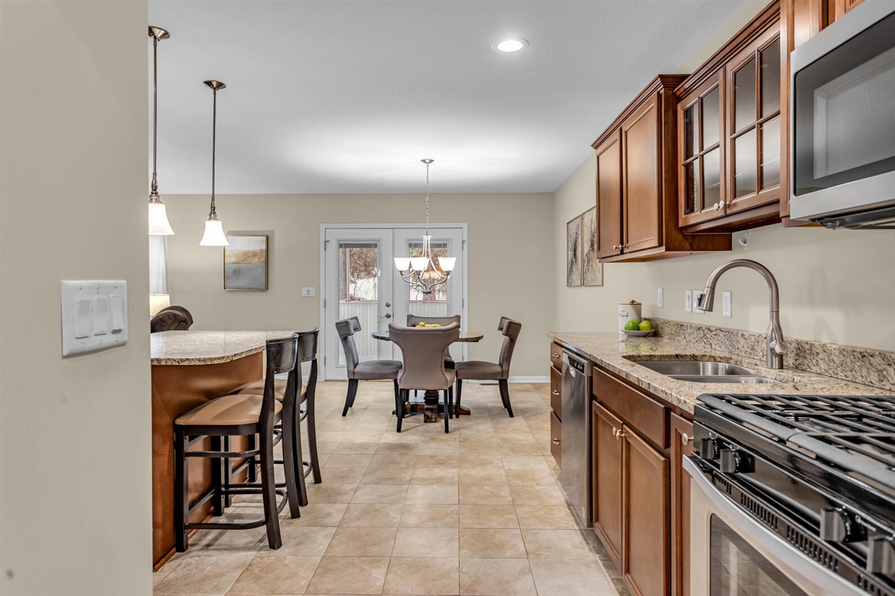 HIGHLY SOUGHT AFTER END UNIT CONDO IN SUMMIT TOWNSHIP. Featuring 2 bedrooms & 2 full baths, this ranch home is located in Terrace Hills, a desirable active adult community. This move-in-ready gem features a vibrant, well-maintained 50+ community, ideal for those looking to enjoy the next chapter in a carefree & maintenance-free lifestyle. Step inside to a large, sunlit foyer w/ceramic tile flooring, opening to the well-appointed kitchen w/eating island, warm wood cabinetry, stainless steel appliances & granite counters. The dining area leads to a scenic 3-season porch through French doors. A beautiful wooded backdrop lines a natural border where wildlife often visits. This floor plan is easy to love with everything conveniently located on one level. The laundry room connects the kitchen & garage paired with a washer & dryer set, cabinets & drying rack above plus a large closet. Spacious primary suite w/walk-in closet & private bath featuring low threshold tile shower & custom granite