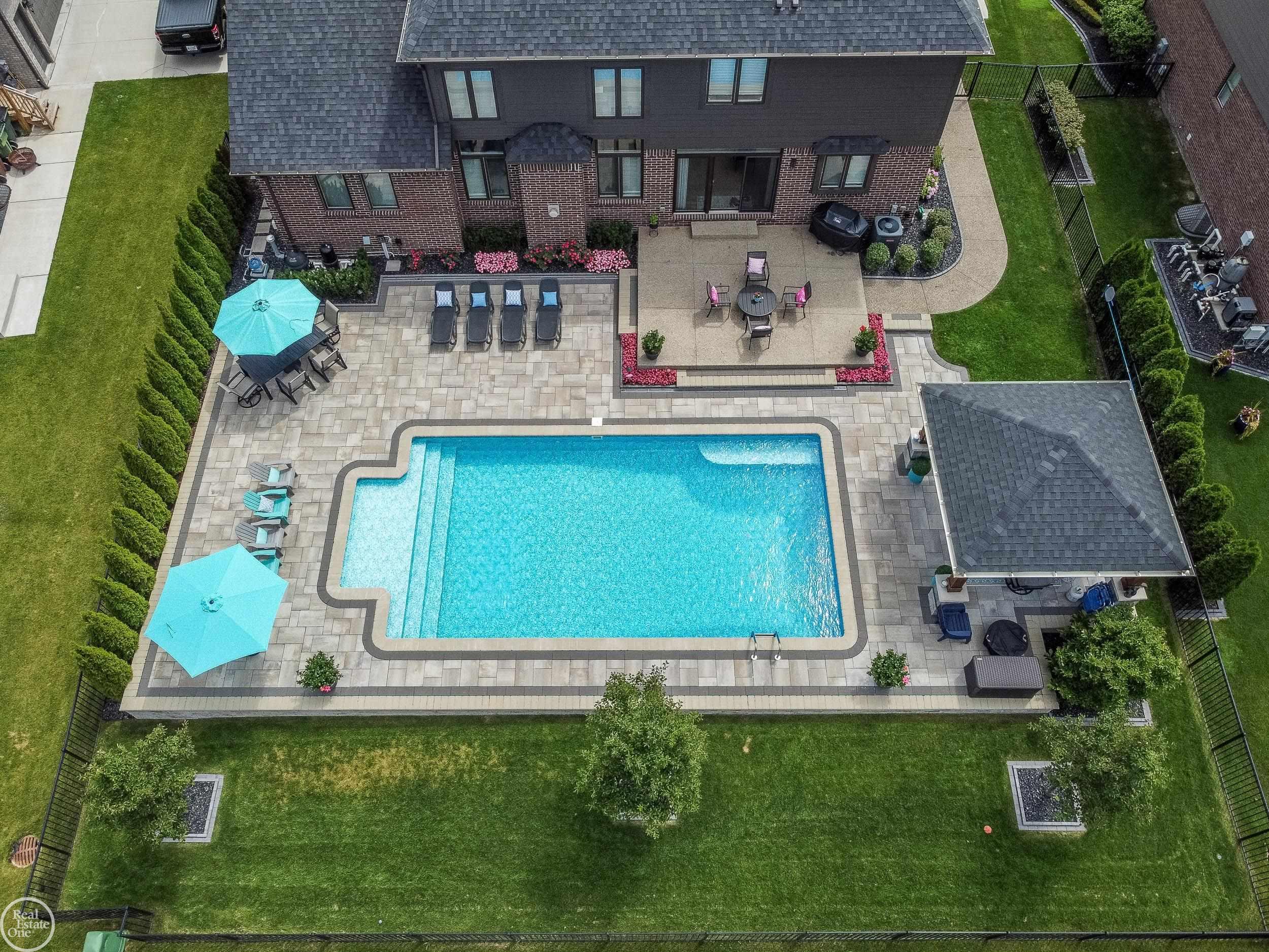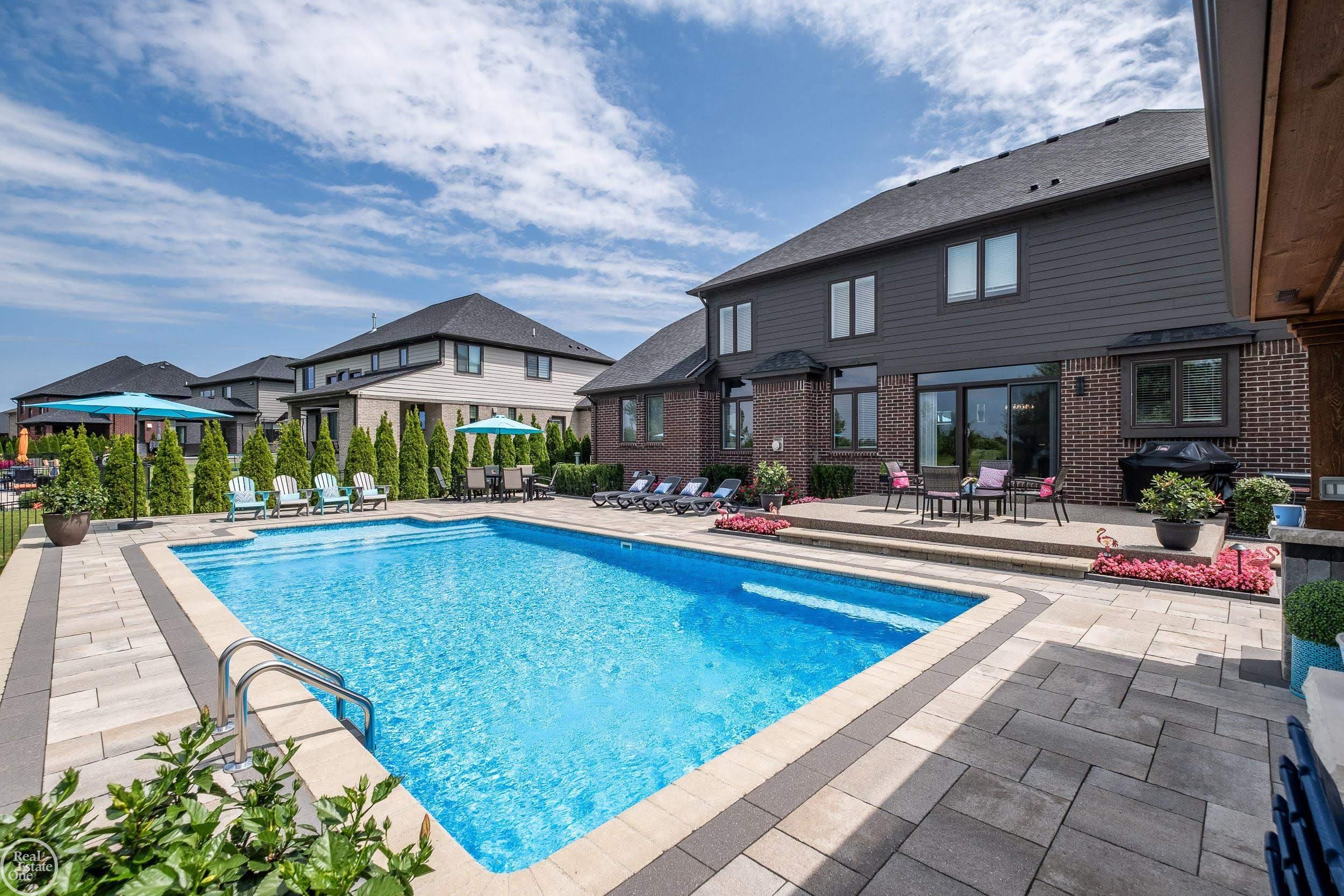 Welcome to this beautiful newer-built split-level home located in the highly sought-after Black Hills Estates, within award-winning Utica Community Schools. This stunning 4-bedroom, 3.5-bath residence with an 3 car garage offers a thoughtfully designed layout blending modern style with everyday functionality. The heart of the home is the modern kitchen, featuring a large center island, ample cabinetry, and a walk-in pantry, making it ideal for both entertaining and daily living. The first-floor primary suite serves as a private retreat with a generous bedroom, a spa-like en-suite bath with dual vanity, and a large walk-in closet. Upstairs offers an additional bedroom suite with a private bath, along with two more bedrooms connected by a Jack-and-Jill bathroom, providing comfort and privacy for family and guests. The real highlight of this home is a true staycation-style backyard, complete with a saltwater pool, aggregate patio, and a beautiful veranda—perfect for relaxing or hosting summer gatherings. The fully fenced yard adds privacy and peace of mind. With modern construction, a functional floor plan, and an exceptional outdoor living space, this home is a rare find in a premier neighborhood. Home features back up sub pump for extra piece of mind and a separate water meter for the sprinkler system.